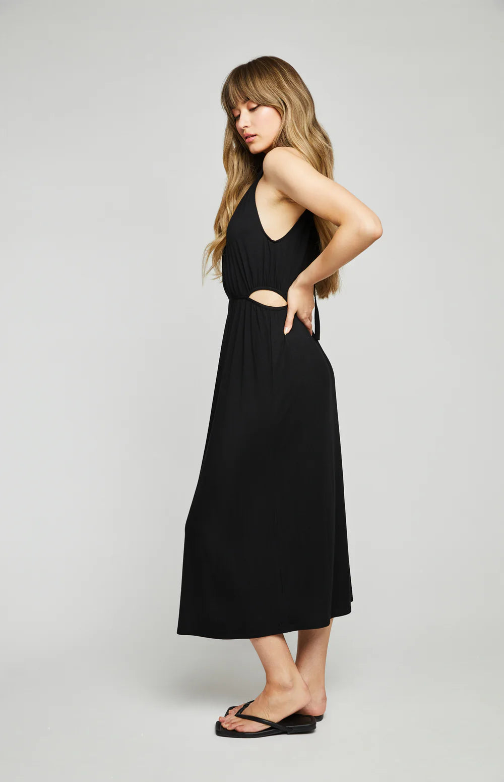 The Edith dress is made of super soft EcoVero rayon jersey. Features include an elasticated waistband, side cut-outs, and a back tie detail.